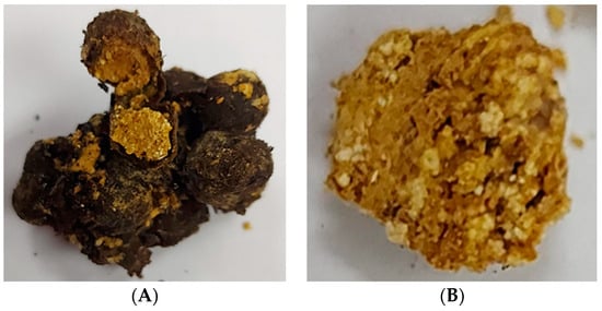 Trigona corvina pollen pots from Panama. (A) An assemblage of pollen pots harvested from a Trigona corvina nest with sliced cerumen of pollen pot to remove the content and (B) fermented pot-pollen mass removed from the cerumen pot. Different colors of pollen represent diverse botanical origins. Photos: ©E. Moreno.