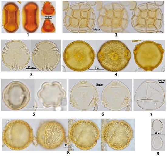 Corbicula pollen loads and the pot-pollen of opened storage pots have visual heterogeneity because different botanical origins of floral pollen have different colors that also vary along the processing of pot-pollen in the nest. The botanical origin of pollen is identified by palynological analysis to determine the adistinctive morphologies of pollen grains with a light microscope [28]. The mature pollen powder of floral stamens has diverse colors and textures (powdery, sticky, waxy); under the microscope, colored oil droplets or the absence of oil can be observed. The pollen size varies from 10 to almost 300 µm, with a spheric, oblate, or prolate shape and surface ornaments, varying in the number of apertures and pores, being of furrow or colporate mixed types, and having monad or polyad arrays, which are all characteristic features used for botanical identifications by palynologists after comparing them with reference slide pollen collections and pollen atlases [29,30,31]. The environmental availability of pollen and stingless bees’ foraging preferences determine the palynological spectra, chemical composition, and biological activity of pot-pollen besides the microbial transformations in the nest. Behavior inside the nest may also add variations more relevant for honey contamination with polleniferous plants than pot-pollen itself contaminated with nectariferous plants, possibly present because pollen needs a small quantity of liquid nectar to amalgamate transportable pollen loads in the corbiculae (P. Vit, personal observation).