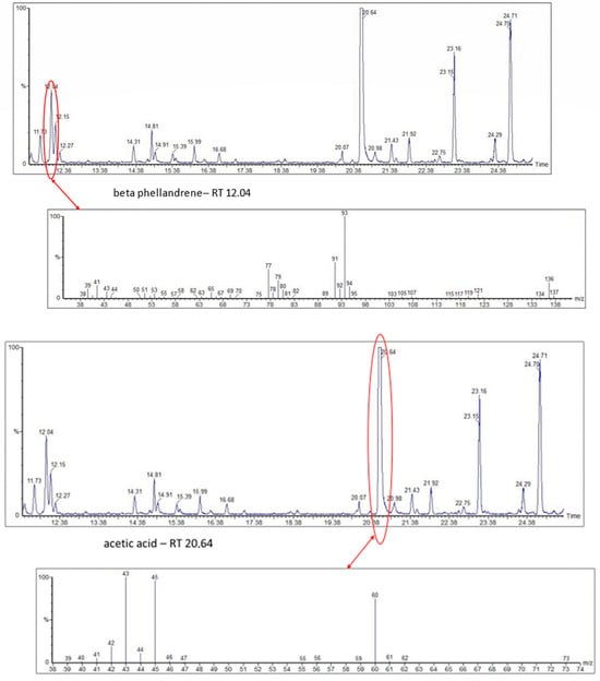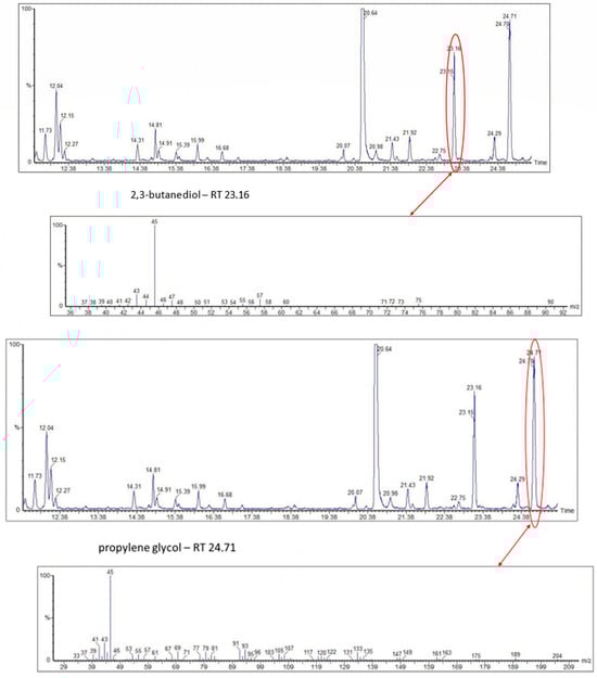 In Figure 3 are illustrated the GC chromatograms and MS spectra of the four most abundant VOCs of Tetragonisca angustula pot-pollen, the microbial acetic acid that confers the distinctive organoleptic smell and sour taste, the suspected microbial origin of polyol 2–3, butanediol, the plant origin monoterpene β-phellandrene, and propylene glycol, which is the second suspected polyol of microbial origin.
