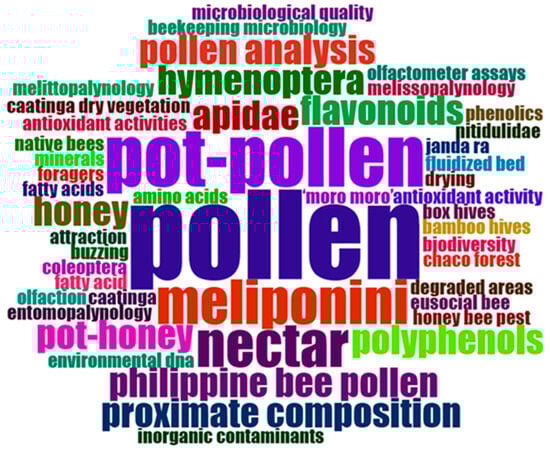 In Figure 4, a word cloud plot was based on 50 author keywords in documents of the pot-pollen dataset since 2014, with a frequency order from 1 to 11 occurrences. The frequencies of author keywords correspond to different colors, position, and size. The largest and most central keywords are the most frequent and were visualized in this plot for pollen (11), pot-pollen (6), meliponini (4), and nectar (3).