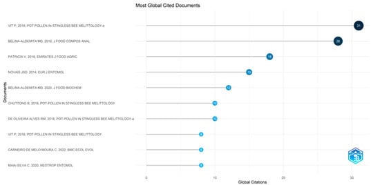 The ten most productive countries on stingless bee pollen and pot-pollen research are ranked in Table 8. The countries that conducted pot-pollen research produced 3 to 15 documents each. The top five countries were from South America, Oceania, and Asia, as well as Brazil, Australia, Venezuela, Indonesia, and Malaysia. Ecuador, the Philippines, Argentina, Austria from Europe, and Mexico from North America were included in the next five countries.