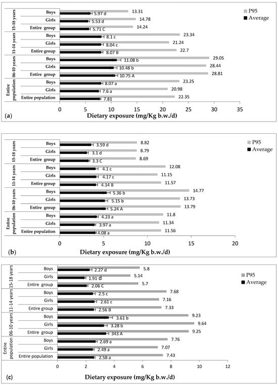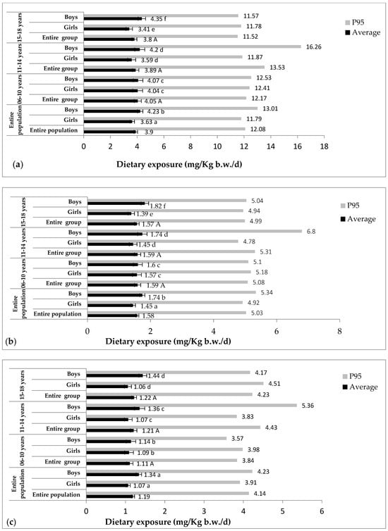 No significant difference was observed between girls (scenario 2: 3.97 ± 0.14 mg/kg b.w./d (36.09% of the ADI); scenario 3: 2.49 ± 0.09 mg/kg b.w./d (22.64% of the ADI)) and boys (scenario 2: 4.23 ± 0.17 mg/kg b.w./d (38.45% of the ADI); scenario 3: 2.69 ± 0.11 mg/kg b.w./d (24.45% of the ADI)) (p > 0.05). However, the difference was very highly significant between age groups (p < 0.001). The highest average exposure and 95th percentile exposures were observed in children aged from 6 to 10 years (scenario 2: Ave: 5.24 ± 0.26 mg/kg b.w./d (47.64% of the ADI); P95: 13.79 mg/kg b.w./d (125.36% of the ADI); scenario 3: Ave: 3.43 ± 0.18 mg/kg b.w./d (31.18% of the ADI); P95: 9.25 mg/kg b.w./d (84.09% of the ADI)), followed by children aged from 11 to 14 (scenario 2: Ave: 4.14 ± 0.18 mg/kg b.w./d (37.64% of the ADI); P95: 11.57 mg/kg b.w./d (105.18% of the ADI); scenario 3: Ave: 2.56 ± 0.11 mg/kg b.w./d (23.27% of the ADI); P95: 7.33 mg/kg b.w./d (66.64% of the ADI)). Lastly, the least exposed subjects were aged between 15 and 18 years (scenario 2: Ave: 3.30 ± 0.14 mg/kg b.w./d (30% of the ADI); P95: 8.69 mg/kg b.w./d (79% of the ADI); scenario 3: Ave: 2.06 ± 0.09 mg/kg b.w./d (18.73% of the ADI); P95: 5.70 mg/kg b.w./d (51.82% of the ADI)).
