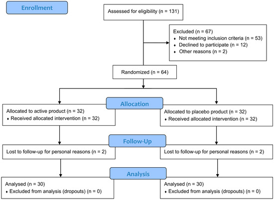 The study screened one hundred and thirty-one subjects (n = 131), 67 of which were excluded for the following reasons: 53 did not meet the inclusion criteria (mainly related to LDL-C and BMI), 12 declined to participate, and two decided to start a statin therapy. The study successfully randomized 64 subjects with high LDL-C levels; 32 subjects were randomized to the active treatment arm, and 32 to the placebo treatment arm. The per-protocol (PP) population comprised sixty subjects (n = 60), with thirty subjects (n = 30) in each treatment group. The reason for being excluded from the PP population (2 subjects in each treatment group) was due to personal reasons not related to products use. The BergavitTM trial participants flow chart is reported in Figure 1.
