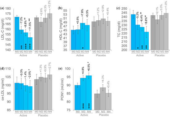 Results of the primary endpoints. (a) Low-density lipoprotein cholesterol (LDL-C) levels. (b) High-density lipoprotein (HDL-C) cholesterol levels. (c) Total cholesterol (TC) levels. (d) Oxidized low-density lipoprotein (ox-LDL). (e) Paraoxonase activity (PON1). The intragroup (vs. baseline) statistical analysis is reported within the bars by the symbol *, while the intergroup (active vs. placebo) statistical analysis is reported above the bars by the symbol #, as follows: */# p < 0.05, **/## p < 0.01, ***/### p < 0.001.