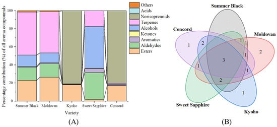 Percentage contributions of each class of aroma components (A) and Venn diagram of aroma-active components (B). The numbers in (B) represented the number of compounds in each respective region, with overlaps indicated intersection between the sets.