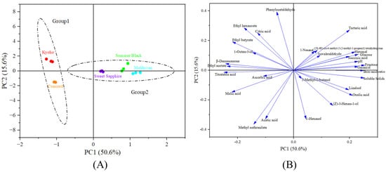 Score plot (A) and loading plot (B) of five grape varieties based on physicochemical and aroma properties.