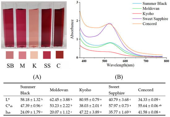 Figure 3 illustrates the colors and spectra of the five grape juice varieties, revealing significant variations in color. Kyoho exhibited a notably lighter color than all other varieties with the lowest absorbance at λmax (Figure 3B). Sweet Sapphire, on the other hand, showed the most intense red color among all samples. Aside from C*ab, no significant differences in color parameters (L*, hab) were observed between Summer Black and Moldovan. Concord, with a monomeric anthocyanin content of 61.11 mg cyanidin 3-glucoside equivalent/L, lower than that of Sweet Sapphire, Summer Black, and Moldovan (Table 5), unexpectedly exhibited the second most intense color (Figure 3), presenting an intriguing phenomenon that warrants further investigation.