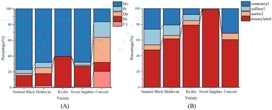 Acylation can also significantly affect the color and stability of anthocyanins. Figure 4B shows the ratio of acylated pigments in the five grapes. Summer Black had the highest acylation ratio (52.5%), while Sweet Sapphire had the lowest (1%). The main types of acylation were identified in p-coumaric acid, caffeic acid, and acetic acid. These identifications are tentative, based on retention time, order of elution, spectra, mass, MS/MS, and comparison to the literature. The acylating groups can protect one side of the pyrylium ring from nucleophilic attack, thereby increasing the stability of the anthocyanin and its color [67].