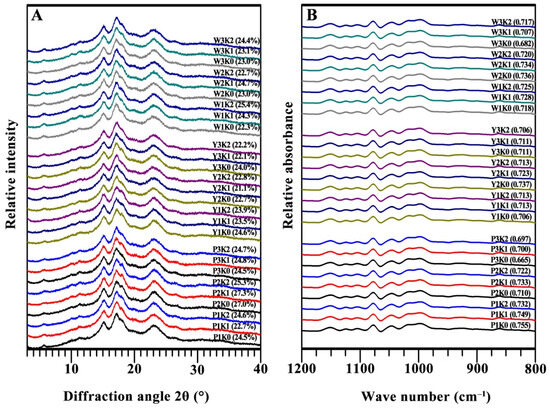 XRD patterns (A) and ATR-FTIR spectra (B) of starch. Values in parentheses are shown for relative crystallinities (RCs) (A) and ordered degrees (ODs) of starch, as calculated by the absorbance ratios of 1047 and 1022 cm−1 (B).