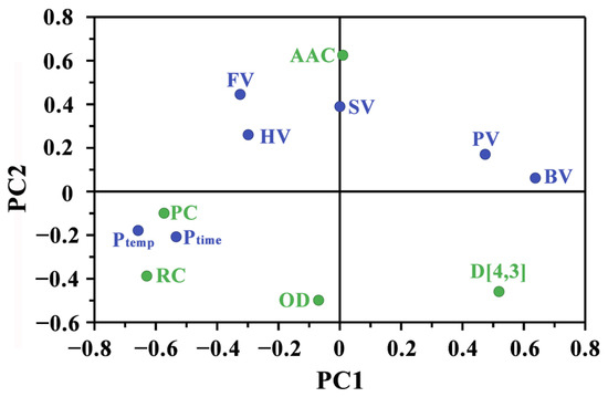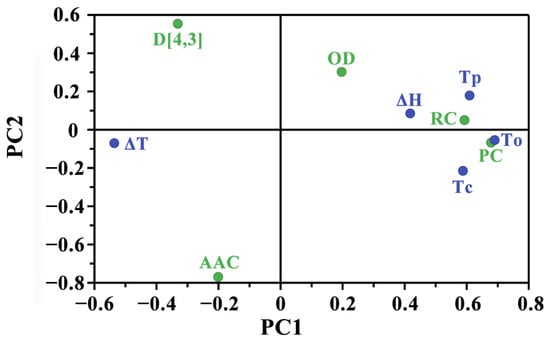 Partial least squares regression (PLSR) is a statistical technique that models the relationship between a set of predictor variables and one or more response variables by extracting latent variables that maximize the covariance between them. The results of the PLSR analysis of starch are shown in Figure 2. The principal components 1 and 2 contributed to 28.4% and 38.0% of the variance, respectively. The PLSR loading plot showed that the relative crystallinity (RC), ordered degree (OD), and protein content (PC) had a significant positive correlation with starch thermal properties including To, Tp, Tc, and ΔH. The apparent amylose content (AAC) showed a negative correlation with starch thermal properties. Apart from this, the granule size (D [4,3]) had a negative correlation with To, Tp, Tc, and ΔH. Previous research also reported that D [4,3] was negatively correlated with starch thermal properties, while the relative crystallinity was positively correlated with thermal properties [27]. In the present research, different responses to K fertilization treatment may have been caused by different granule sizes, protein contents, apparent amylose contents, and relative crystallinities in different varieties.