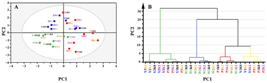 To further elucidate the effects of K fertilizer treatment on various varieties, a hierarchical cluster analysis was conducted, and the results are presented in Figure 4B. Principal components 1 and 2 contributed to 49.4% and 25.7% of the variance, respectively. When combined with the PLS-DA results (Figure 4A), the hierarchical cluster analysis revealed distinct clusters among the sweet potato varieties, underscoring significant differences in starch properties in response to varying levels of K fertilizer. The purple-fleshed varieties P1, P2, and P3 with different K fertilizer treatments were primarily grouped together, showing minimal variation across K treatments, while the white and yellow-fleshed varieties were distributed into separate clusters with noticeable distinctions between the different K treatment levels, particularly for W1, W3, and Y3. Overall, this analysis demonstrated that K fertilizer can differentially influence starch functionality depending on the sweet potato varieties, offering opportunities to tailor starch properties for specific end uses.