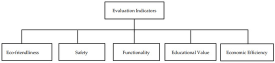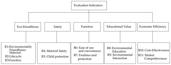 The research begins with a theoretical foundation, including principles such as the 4R1D principle and national environmental standards. Furthermore, a survey was conducted to collect consumer awareness data from 250 parents of children, which formed the foundational data for the evaluation index system. Through an in-depth analysis of the concept of sustainability and dialogs with consumers, the study established an evaluation system consisting of five primary evaluation indicators and eleven secondary indicators. This system encompasses key dimensions such as eco-friendliness, safety, functionality, educational value, and economic efficiency to ensure the comprehensiveness of the evaluation process, as illustrated in Figure 1.