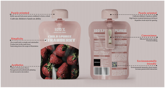 In the context of regulations, global legislative trends on sustainable food packaging are continuously strengthening. Regions such as Europe, India, South Korea, Japan, China, Australia, the United Kingdom, and the United States are enacting policies to reduce waste and promote a circular economy [12]. These regulations are driving the development of new eco-friendly packaging materials and encouraging companies to adopt greener packaging methods. Additionally, Elford’s research was the first to explore environmental sustainability practices in food provision within Australian childcare services. Their preliminary survey results showed that most childcare services have incorporated environmental sustainability into their policies, highlighting the potential of policies in promoting sustainable food practices [13]. In terms of user needs, Victoria Norton’s study found that 74% of consumers are willing to pay a premium for sustainable packaging, indicating a strong market demand for sustainability [14]. This emphasizes the importance of considering the environmental and sustainable attributes of packaging in children’s food design. A. Kurtz and R. Thomopoulos focused on consumer behavior, particularly parents’ concerns about the safety and sustainability of baby food. Their large-scale survey in France analyzed consumer priorities and risk perceptions when selecting baby food. The study found that health factors, such as the absence of harmful substances and nutritional balance, were the top concerns, far outweighing environmental and price factors. Additionally, chemical contaminants and the safety of packaging materials were the most worrying issues for consumers [15]. Alazne Arraztio Cordoba emphasized that safety is a critical element in the design of baby and children’s food packaging, and packaging elements significantly influence children’s food choices and intake [16]. D. Folinas et al. noted that safety and protection are major concerns for parents, with designs such as pull tabs and tamper-evident seals reducing potential risks for children when unsupervised [17].
