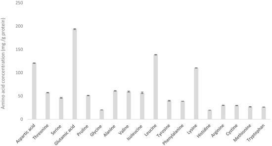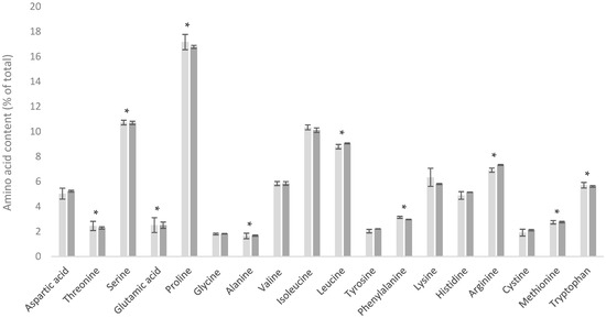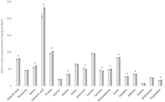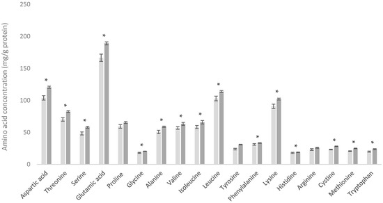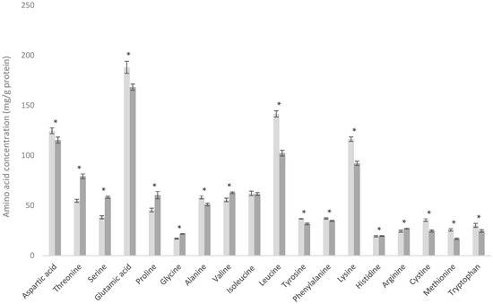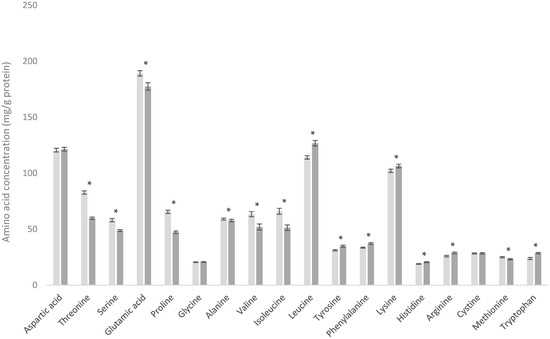 Amino acid profiles of cheese whey protein concentrate (WPC-C) (■) and lactic acid casein whey protein concentrate (WPC-L) (■). * Indicates statistical difference (p < 0.05).