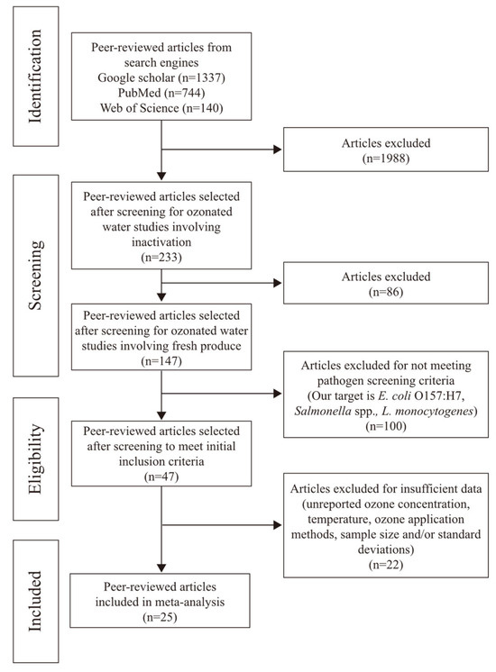 As shown in Figure 1, these studies were screened by the steps outlined in Moher et al. (2010) [37]. To begin with, in the identification step, thesis and review papers were eliminated to prevent duplicate data. Only studies related to microbial inactivation on fresh produce were included in the primary data; studies evaluating other aspects, such as fresh produce quality and shelf life, were rejected. Studies using treatment methods such as cold plasma or gaseous ozone treatments were also excluded. In the screening step, studies that used other food types, food contact surfaces, cross-contamination, or wastewater were rejected. Only studies related to the inactivation of fresh produce were included. After that, as a third criterion, the primary study had to clearly report the pathogens (E. coli O157:H7, E. coli O157:H7 surrogate, Salmonella spp., L. monocytogenes, and L. monocytogenes surrogate), not other pathogenic bacteria such as Vibrio parahaemolyticus, Bacillus cereus or a broad range of bacteria, viruses, and fungi. As a final criterion, papers were eliminated if they did not specify the following standard: ozone concentration, ozone generation method, the temperature of the treatment solution, the population of pathogens both before and after treatment, or the log reduction in a pathogen, sample size, and/or standard deviations. Considering all these requirements, 25 primary studies were included in this meta-analysis.