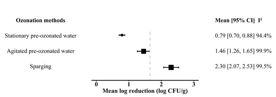 Although the meta-regression models using the ozonation method can help to better understand the process conditions influencing microbial reduction, one should note that the I2 remains high for three ozonation methods (Table 3). This indicates that numerous factors, not yet fully explored in the current literature, could elucidate the disparities in the microbial log reduction, especially those directly influencing the physicochemical properties of ozone, such as stability, solubility, and reactivity.