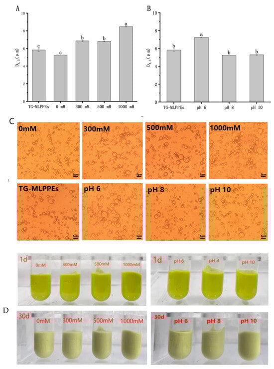 Droplet size (A,B), microscopic morphology under optical microscope (C), and emulsion appearance before and after 30 days of storage under different ionic strength and pH conditions (D). Different lowercase letters denote significant differences (p < 0.05).
