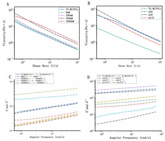 Effect of shear rate on apparent viscosity of emulsions (A,B). Effect of frequency on emulsions’ storage modulus (G′) and loss modulus (G′′) (C,D).