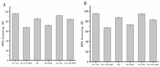 In the food industry, curcumin’s strong antioxidant properties can help delay food oxidation and prevent the oxidative rancidity that commonly occurs in oil-rich foods, thereby extending their shelf life. Additionally, as a natural ingredient, curcumin aligns with consumer demand for healthy, natural additives. In this study, curcumin was dissolved in soybean oil to serve as the dispersing phase for preparing high-internal-phase Pickering emulsions. The successful incorporation of curcumin into the emulsion system imparted antioxidant properties to the emulsion. To assess the protective effect of TG-MLP encapsulation, the antioxidant activity of curcumin was characterized by its DPPH and ABTS free radical scavenging activities before and after 30 days of storage. High-internal-phase Pickering emulsions containing curcumin, stabilized using TG-MLP at pH 8, were designated as Cur-HIPEs. For comparative analysis, high-internal-phase Pickering emulsions without curcumin (TG-MLPPEs) and curcumin dissolved in soybean oil (Oil-Cur) were used as control groups to evaluate the antioxidant capacity.