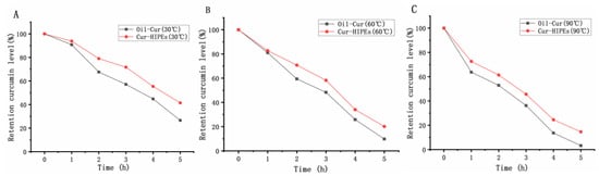 As illustrated in Figure 4, the degradation rate of curcumin was notably slower in Cur-HIPEs compared to Oil-Cur, highlighting the protective effect of the emulsion on curcumin. It was observed that curcumin content decreased more severely after heating at 90 °C than at 30 °C and 60 °C. At 90 °C, the emulsion provided no significant protection for curcumin over time. This observation is consistent with the Arrhenius rate law, which states that reaction rates increase exponentially with temperature [39]. At higher temperatures, molecular collisions occur more frequently, leading to accelerated degradation of curcumin [40]. Young et al. reported that only 66% of curcumin was recovered from a silica-stabilized emulsion stored at 70 °C for 30 min [41]. This result suggests that high-temperature storage presents the greatest risk for curcumin degradation under various conditions. Therefore, to optimize curcumin stability, it is recommended to store emulsions at lower temperatures.