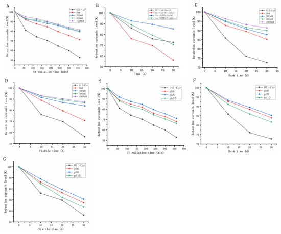 Effects of Pickering emulsion storage in UV (A), dark (C), and visible light (D) on curcumin retention under different ionic strength conditions; Effects of Pickering emulsion storage in UV (E), dark (F), and visible light (G) on curcumin retention under different pH conditions; Effects of Oil-cur and Cur-HIPEs storage in dark and visible light on curcumin retention (B).