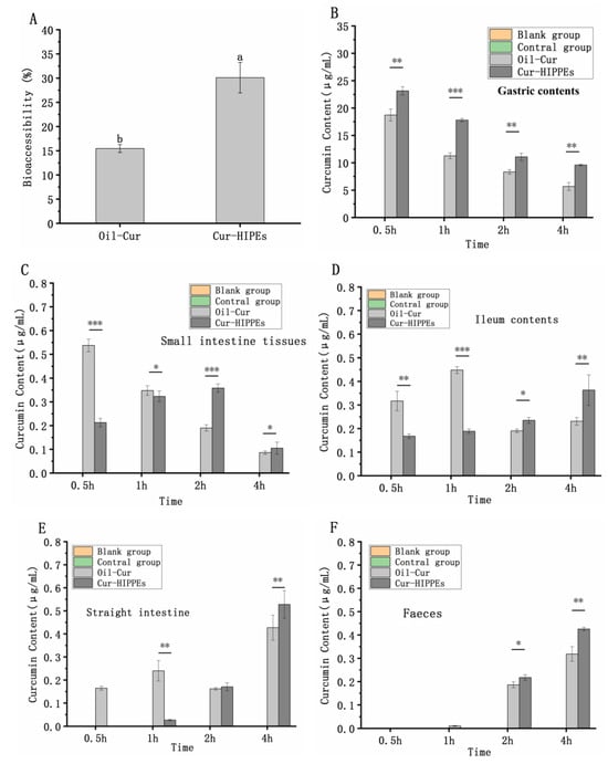 As shown in Figure 6B, curcumin content in the stomach contents of mice gradually decreased over 4 h, with the Cur-HIPE group exhibiting higher levels compared to the Oil-Cur group at each time point. Previous studies have indicated that curcumin is susceptible to degradation in acidic environments [52], indicating that HIPEs offer protection against stomach acidity. In small intestine tissues (Figure 6C), curcumin content decreased over 4 h in the Oil-Cur group but showed an initial increase followed by a decrease in the Cur-HIPE group. This suggests a rapid increase in oil content in the small intestine, peaking after 0.5 h, while the emulsion remains present for a longer duration, peaking at 2 h. In the ileum tissue (Figure 6D), curcumin content in the Oil-Cur group initially increased and then decreased over 4 h, whereas in the Cur-HIPE group, it exhibited a continuous increase, indicating prolonged presence of oil in the ileum without reaching a peak.
