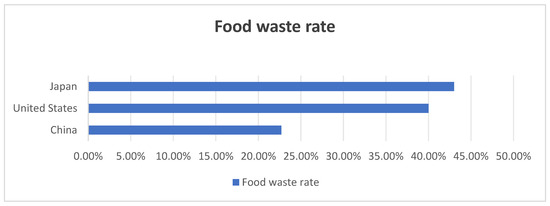 Data shows that China’s food loss and waste rate is 22.7%, US food waste accounts for about 40% of the entire US food supply, and Japan’s unopened food discarded in its original packaging, the amount of direct waste, and discarded leftovers accounted for 43% of the total (as shown in Figure 1) [1,25,26].