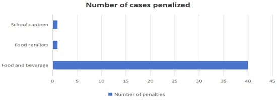 Typical cases show that the administrative penalties are mainly focused on food service operators, with fewer regulations on multiple subjects such as catering platforms, media, schools, and food producers (as shown in Figure 2), which may lead to food waste at the production end and in the transmission chain. In terms of cases, there were 40 cases of caterers being penalized, one of a food retailer and one of a school canteen (as shown in Figure 3).