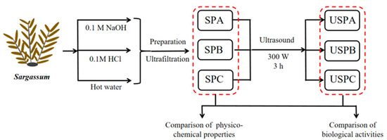 Technology roadmap. (SPA: alkali-assisted extraction of polysaccharide from Sargassum; SPB: acid-assisted extraction of polysaccharides from Sargassum; SPC: hot water extraction of polysaccharides from Sargassum; USPA: ultrasonic treatment SPA; USPB: ultrasonic treatment SPB; and USPC: ultrasonic treatment SPC).