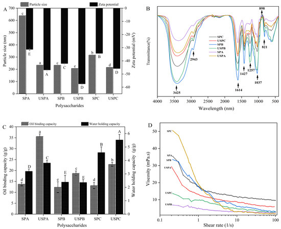 Particle size and zeta potential (A); FT-IR (B); oil-binding capacity (OBC) and water-holding capacity (WHC) (C); and viscosity (D) of SPs. Data are expressed as mean ± SD (n = 3). Significant differences (p < 0.05) are indicated with different letters.