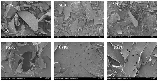 SEM is an effective tool for observing the microscopic surface morphology of polysaccharides. The images of SPs are shown in Figure 3. The surfaces of SPA, SPB, and SPC were smooth, dense, and irregularly lamellar. The SEM image of SPA showed large and irregular fragments with a smooth surface, which might be due to the aggregation of total sugars, consistent with the results of particle size determination. The surface of SPB was slightly rough with many fine lumpy particles, which might be due to the aggregation of glucuronic acid cross-links. SPC showed relative roughness, with a fine fragmented structure. After ultrasonication, the SPs showed significant differences in morphology and shape. The SEM images of USPA, USPB, and USPC showed a fragmented appearance and porous structure, which might be attributed to the accelerated diffusion and dissolution of polysaccharides by transient high pressure, turbulent shear, and strong physical cavitation effects [53].