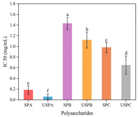 The inhibition of α-glucosidase activity is one of the most effective methods used to control hyperglycemia. In this experiment, the potential ability of SPs to lower blood glucose was initially evaluated by using an α-glucosidase inhibition assay. All the SPs demonstrated concentration-dependent inhibition of α-glucosidase. As shown in Figure 4, the IC50 values were 0.182 ± 0.08 mg/mL (SPA), 0.98 ± 0.098 mg/mL (SPC), and 1.43 ± 0.11 mg/mL (SPB) in descending order (p < 0.05). The reason behind the strong inhibitory effect shown by SPA might be related to its low Mw and high glucuronic acid content. Fu et al. [54] reported that the ability of the -COOH group on the sugar chain of loquat leaf polysaccharides to form strong acting hydrogen bonds with residues on α-glucosidase resulted in a decrease in the activity of the glycosidase. After ultrasonic treatment, the IC50 of the SPs extracted with different solvents was reduced, with USPA having the lowest IC50 value (0.056 ± 0.05 mg/mL), 69% lower compared to the SPA; the IC50 was 21.6% lower in the USPB than the SPB; the USPC IC50 was 33.7% lower than SPC. The ultrasonication brought the low-Mw polysaccharides closer to the active site of α-glucosidase, causing a conformational change in the enzyme, thus leading to inactivity. The same results were found by Guo et al. [55]. The results demonstrate that different solvent extractions affected the α-glucosidase activity, and a certain degree of physical treatment increased the α-glucosidase inhibitory activity. The high α-glucosidase inhibitory activity of polysaccharides might be due to the lower Mw and greater number active sites exposed. Xiong et al. also found that alkali-extracted Evodiae fructus polysaccharides had stronger α-glucosidase inhibitory activity than acid-extracted Evodiae fructus [56].