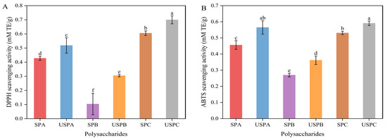 As shown in Figure 5A,B, the SPs showed significant scavenging ability against DPPH and ABTS free radicals (p < 0.05). Compared with SPB, SPA and SPC had better free radical scavenging capacities for DPPH (0.427 ± 0.014, 0.605 ± 0.016 mM TE/g) and ABTS (0.456 ± 0.027, 0.531 ± 0.102; mM TE/g), respectively. The higher-Mw SPC had better free radical-scavenging capacity than SPA and SPB, which was similar to the results by Chen et al. [34]. DPPH and ABTS radical scavenging were significantly enhanced in ultrasound-degraded SPs (p < 0.05), with a consistent trend. The inhibition of DPPH and ABTS radicals was increased by SPA (21.25% and 23.9%), SPB (65.97% and 34.13%), and SPC (15.58% and 11.3%), respectively. The results indicate that ultrasonic treatment enhanced the antioxidant activity of SPs, which might be related to the decrease in Mw, particle size, and viscosity, as well as the increase in glyoxylate content induced by ultrasonic treatment. Yan et al. [57] found that the antioxidant activity was enhanced with the decrease in the Mw of Phellinus linteus mycelia polysaccharides caused by ultrasonic treatment.
