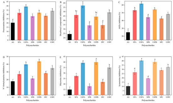As shown in Figure 6A–F, the SPs expressed good inhibition (p < 0.05) of the products of all three stages of glycosylation, with the effects all being better than that of the positive control, aminoguanidine (AG). Among the SPs, SPA demonstrated the strongest inhibitory effects on fructosamine, dicarbonyl compounds, and AGEs, which could be attributed to the lower Mw and higher content of glucuronic acid content. This is the same as the results reported by Gong et al. [3]. The inhibition rate of SPs against the glycosylation assay is shown in Figure 6A–C. Compared with SPB, SPA and SPC had better inhibition rates against glycosylation products (p < 0.05). In the primary stage, SPA and SPC inhibited fructosamine products at the rate of 31.84% and 28.40%, respectively. In the intermediate stage, SPA and SPC inhibited α-dicarbonyl compounds at the rate of 46.21% and 34.58%, respectively. And in the final stage, α-dicarbonyl compounds induced the rapid cross-linking of proteins to produce stable end product AGEs, and The inhibition rates of the AGEs were 53.25% and 42.96%, respectively. The inhibitory effects of the SPs after ultrasound treatment were stronger than those of untreated polysaccharides (p < 0.05). This indicates that the SPs had better anti-glycosylation effects after ultrasound treatment because after ultrasound treatment, the Mw of the SPs was reduced, the particle size became smaller, and the specific surface area became bigger. This resulted in more sites to bind with free radicals, both shielded or terminated radicals, and effectively inhibited the oxidative reactions triggered by the free radicals, thus blocking the non-enzymatic glycosylation reaction at the oxidative stage [60]. The inhibition rate of USPA reached more than 50% at the middle and end stages, indicating that the inhibition mainly occurred at this stage.