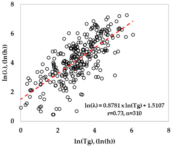 The lag time was modeled by following the relative lag time concept (RLT) by estimating the parameter K [25]. This parameter explains the physiological state of cells, a constant value for cells with similar pre-inoculation history. When these cells are exposed to the same favorable growth conditions, the amount of work to be done by bacteria will remain constant to adapt to the newly growing environment. Therefore, the ratio of ln(l/Tg) will produce a constant value, and the linear regression analysis (Figure 1) between ln(l) and ln(Tg) should produce a slope value close to 1. The median value for ln(l/Tg) ratios was estimated, and the exp(median) is the parameter K. Finally, the lag time was calculated using Equation (25). The validation of lag time prediction was done by estimating the bias and accuracy factors between observed and predicted ln(l) using Equations (21) and (22). The mean prediction error (MPE) for lag time was calculated using Equation (26).