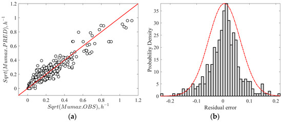 The logistic-with-delay primary model was fitted to estimate the maximum exponential growth rates (µmax, log CFU/h) and used for secondary modeling. The logistic-with-delay model was used due to widespread usage and recognition in the literature as one of the most accurate models to describe the sigmoidal growth curve of Listeria. This model also accounts for the lag phase accurately, which enhances its reliability and usage. Similarly, the gamma secondary equation was employed in the current study due to its simplicity, robustness, and ability to quantify the effect of multiple factors on the growth of Listeria using the gamma function. Additionally, the gamma equations also describe the growth and no-growth boundaries through a graphical representation. In this context, a secondary model was developed by fitting Equation (6) to growth rates as a function of seven environmental factors. To be consistent with the literature, optimum growth rate (μopt) is reported as h−1, while the actual unit of μopt is log CFU/h. During the initial fitting of gamma equations to the raining dataset, due to the limited growth rate, the pHopt and pHmax values were not estimated. Instead, these values were selected [25,59] and fixed at 7 (pHopt), and 9.6 (pHmax), respectively, in the simultaneous fitting procedure. Except for fixed parameters, the remaining parameters were simultaneously estimated by following the earlier procedures [28,32]. The optimal growth rate (µopt) of the secondary model (Equation (6)) estimated by the model in the present study was 1.126 h−1 across all meats, which was within the range of literature values for processed meat (Table 3). The confidence interval for optimal growth rate (µopt) was slightly high (0.65 to 1.66 h−1) due to the variability in growth rates across the meat products and strain differences. The large variability causes difficulties in defining the growth trends (using µopt) in a mixture of food products. Similarly, a study [29] reported a high variability of µopt between 0.18 and 2.02 h−1 with a mean value of 0.49 ± 0.32 h−1, which includes meat (0.63 ± 0.73 h−1), seafood (3.61 ± 5.71 h−1), beef (0.18 ± 0.14 h−1), and poultry (0.765 ± 0.83 h−1) products. Figure 2a represents the correlation between the observed and predicted growth rates in meat products by the secondary model. Figure 2b shows the histogram plot of residual error, which is an indicator of over- and under-predictions of growth rates by the model. The negative values refer to over-predictions, the positive values refer to under-predictions, and values closer to the zero-region column refer to accurate predictions. The histogram plot with a symmetrical distribution of residual error around zero demonstrates the great robustness and accuracy of the model. In the development stage, the secondary model had a coefficient of determination R2 of 0.86 and RMSE of 0.06 μmax, demonstrating the overall quality of fit across the seven environmental conditions. On the other hand, the gamma model developed for Listeria growth prediction in meat products had an RMSE of 0.081 and R2 of 0.63 [22]. In another study, RMSE ranged between 0.919 and 1.148 and R2 adj from 0.81 to 0.88 for Ratkowsky square root model fitting in Listeria growth rate data in high-pressure processed cooked ham [31].