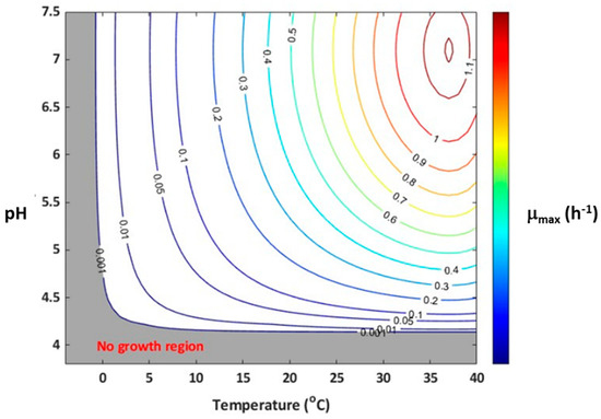 Growth/no growth contour plot of µmax as a function of pH and temperature. The contour lines represent µmax predicted using Equation (6) with the model parameters reported in Table 3.