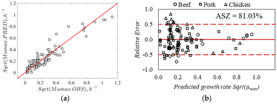 Several Listeria models in the literature have been developed in culture media, and limited models have been developed and validated in the RTE meat matrix. It was well established that the growth medium can significantly influence Listeria behavior, particularly the complexity of the food matrix [27]. The porosity in food imbalances microbial stability, while starch ingredients can immobilize the cells of bacteria, resulting in retarded growth of cells in food compared to culture media [38,61]. Therefore, the secondary model developed in this study was validated using exclusive RTE meat matrices data collected from the literature (refer to Table 1, Table 2 and Table 3). The estimated gamma model’s parameters corresponding to L. monocytogenes (shown in Table 3) using Equations (6)–(12) were reused. The model’s prediction was evaluated by comparing the relative errors between observed and predicted growth rates using the acceptable simulation zone (ASZ, ±0.5 log CFU/g/h) approach. The correlation between the square root of observed and predicted growth rates is presented in Figure 4a; the root mean square error (RMSE) criteria was also computed to assess the average prediction error by the model. In the validation step, the model includes an RMSE of 0.076 μmax and a coefficient of determination (R2) = 0.87. For the model predictions, about 81.03% of relative errors were within the acceptable simulation zone (ASZ), which is above the minimum acceptable value of 70% (Figure 4b). The validation of the new secondary model in the present study provided an acceptable Listeria growth prediction.