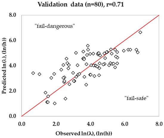 A total of 596 growth and no growth data were collected in this study, out of which only 480 growth rate (μmax) data and their corresponding lag time (including lag = 0) qualified the first filter criteria (Table 5) to develop a secondary growth rate model. The second filter criteria were applied to exclude zero lag time and select good quality data for lag time modeling. Out of 480 training data, about 310 lag time values were used to estimate the parameter K. Similarly, out of 116 validation lag time values, about 80 lag time values (excluding R2 ≤ 0.9, Obs. lag < 1 h, Pred. μmax < 0.0001/h (n = 2)) were used to validate the lag time model. The logarithmic ratio of lag and generation time resulted in a median value of 1.31, and the exponential of the median value was estimated to be 3.72 (parameter K). During validation, the lag time was estimated using Equation (25) with the value of growth rate from the growth rate model with interaction and with the previously estimated physiological state of cells (K = 3.72). In a similar study, a median value = 1.128 and K = 3.09 were estimated (n = 1176) for Listeria, including culture broth, dairy, meats, eggs, and seafood as growth mediums [25]. The K value in the current study for RTE meat products is slightly higher (3.72) than the previous study (3.09), and it may be attributed to K estimated from a mixture of culture broth (shorter lag phase), dairy, and seafood. In this study, the estimated Bf was 1.07 for the lag time model, indicating that the predicted lag time was fail-dangerous by 7% for the validation dataset (Figure 5). The mean prediction error (MPE) for the lag time model estimated using Equation (26) was 137.3% for the training dataset, which was slightly less (128.8%) for the validation dataset. The RMSE value for the predicted lag time was 0.98 ln(h), and the correlation coefficient (r) was 0.71. The lower correlation coefficient indicates that the lag time model is less accurate than the growth rate model.