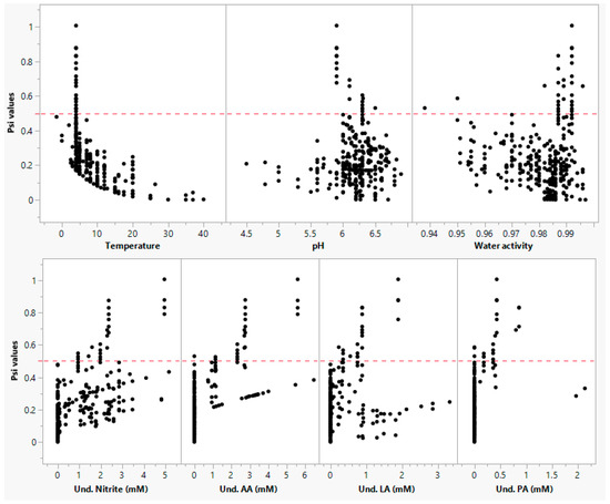 The MICs of undissociated nitrite and organic acids estimated in this study slightly varied from literature values (Table 3), and this could be due to variability in strains, food matrices, endogenous inhibitors (e.g., natural lactic acid), and their interactions with added acids, acid calculation method, modeling techniques, and experimental methods used [27]. For example, the MICs of lactic acid ranged from 3.6 to 5.7 mM across nine strains, MICs of acetic acid ranged from 6.2 to 18.9 mM across four strains, and MICs of propionic acid ranged from 4 to 8 mM across three strains [42]. Previous studies have reported a significant difference in growth parameters between strains of L. monocytogenes [43,82]. It is important to mention that the MIC estimated in culture media would be different from the MIC estimated in the meat matrix, including background microflora and growth inhibitors. A study by [83] recorded that the Listeria growth rate was different under different food matrices, and the exponential growth rate varied significantly among twenty Listeria strains. Therefore, establishing a universal MIC value for organic acids is challenging due to intra-species variation. Another study [48] reported the dependency of MICs of undissociated acids on pH and a significant variation in MICs of organic acids between the Listeria strains. This study also indicated that strain variation significantly influences the concentration of acids required to inhibit growth. For instance, in their study, the MICs for different strains for the pH range studied varied between 12.2 and 30.2 mM for acetic acid and 4.7 and 25.1 mM for propionic acid. The optimized MICs in the current study could be a universal MIC value for all inhibitory compounds in different meat products, including added acids and endogenous lactic acid. In addition, the wide confidence intervals for the MICs of inhibitory compounds could be either due to Listeria strain differences or limited data points in particular regions [42,48,84]. In the current study, the large confidence intervals of MIC of antimicrobials and curing agents were attributed to a lack of growth data, which is one of the limitations of this study. In addition, another study [48] reported that limited (2 to 46 data points per acid) MICs of undissociated acids for L. monocytogenes are available in the literature; such large intervals of undissociated acid values may result in the approximate estimation of the minimal acid concentration that prevents Listeria growth. Therefore, for accurate estimation of the MICs of antimicrobials, it is important to have adequate datasets with closer intervals of undissociated acids. In addition, the undissociated acid concentrations were calculated in this study based on the total volume of food (meat), while acid dissociates in the water phase of unknown volume. The concentration of acids in the water phase is more than the concentration in total meat, which certainly explains the differences in MICs estimated in different studies [27]. Another reason for MIC variations is the differences in the growth substrate, as most literature MICs were estimated in culture media, while the present study estimated MIC in meat matrix.