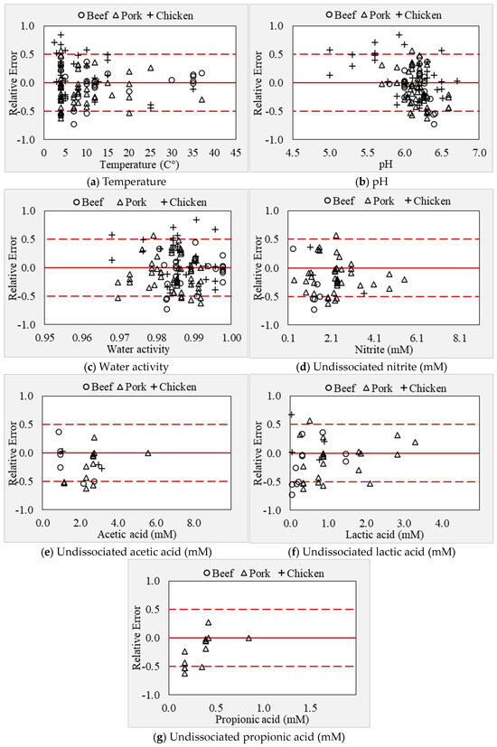 In this study, the model prediction was impacted by the presence of additional antimicrobial or additive compounds in meat formulations that were not considered in the modeling. For instance, in a few studies, the product formulation included one or more compounds such as sodium erythrobate, phosphate, sodium bicarbonate, sodium triphosphate, sodium ascorbate, and other seasoning blends [67,85,86,87,88,89]. Similarly, RTE products such as ham, frankfurters, smoked meat, and sausages included phenols generated from smoke components. These additives may have an indirect inhibitory effect; a study [49] demonstrated the effect of phenols (>10 ppm) in smoked meats on Listeria growth and on Af and Bf values. Similarly, in the present study, the model overpredicted growth rates in a few products containing the above additives. Therefore, to improve the accuracy of the model’s predictions, it is crucial to consider all the factors that have the potential to inhibit the growth of Listeria. At present, there is no single model that considers all factors that may be relevant to all types of food. Therefore, it is important to clearly state the limitations of predictive models to users, including the range of conditions, interpolation region, and the variables considered.