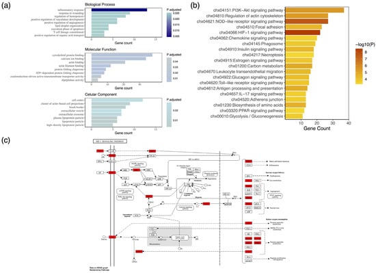Proteomic characterization of goat colostrum whey proteins. (a) Gene Ontology (GO) analysis. Bar plot of the top statistically significantly enriched GO biological processes, cellular components, and molecular functions. (b) Biological pathway analysis. Bar plot of the top 20 enriched KEGG pathways. Colostrum proteins are the central components of mammary gland development and immune system processes. (c) Complete map of the HIF-1 signaling pathway, the most statistically significant molecular pathway of the identified proteins, depicted here in red.