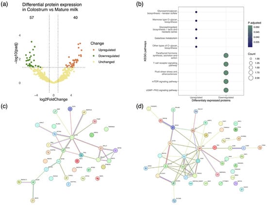 Proteomic variability associated with lactation stage in caprine mammary secretions from clinically healthy goats. (a) Volcano plot depicting protein differential expression in colostrum relative to mature milk. (b) Dot plot depicting the functional classification of differentially expressed proteins in colostrum and milk. Functional annotation of proteins performed in reference to the AnnotationHub Capra hircus KEGG annotation collection. (c,d) StringDB protein interaction networks representing pathways associated with upregulated and downregulated proteins in colostrum. Proteins are presented as color-coded nodes, and edges indicate protein–protein interactions.