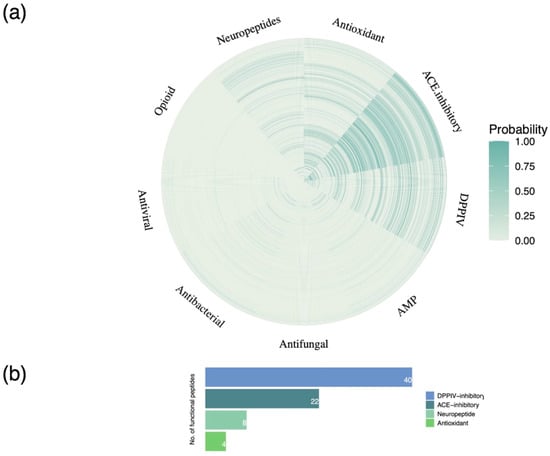 Subsequently, the generated peptides were filtered based on potential bioactivity to retain potentially active sequences. Specifically, an advanced machine learning algorithm was used to evaluate the peptide bioactivity by assigning each sequence a probability score ranging between 0 and 1 [50]. Peptides allocated a score >0.5 (deemed biologically active) were retained, and their specific bioactivities were investigated. The bioactive peptides were mapped to 9 functional classes using a state-of-the-art machine learning-based (deep neural network) predictor [51]. Specifically, each peptide was assigned a score equal to the probability of belonging to the antioxidant, ACE-inhibitory, dipeptidyl peptidase IV (DPPIV)-inhibitory, antimicrobial, antifungal, antibacterial, antiviral, opioid, or neuropeptide bioactivity categories. Peptides functionally annotated with a high confidence (>80%) to each of the bioactivity categories were further evaluated using specialized algorithms with regard to their theoretical activity [52,53,54,55]. All the resulting plots were generated in RStudio with the ggplot2 package [43,44].
