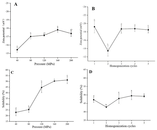 The effect of the DHPM parameter on the zeta potential and solubility of PPI: zeta potential was plotted on applied pressure (A) and on homogenization passes (B); solubility was plotted on applied pressure (C) and on homogenization passes (D); data with an identical letter indicate no significant difference between them (p > 0.05).
