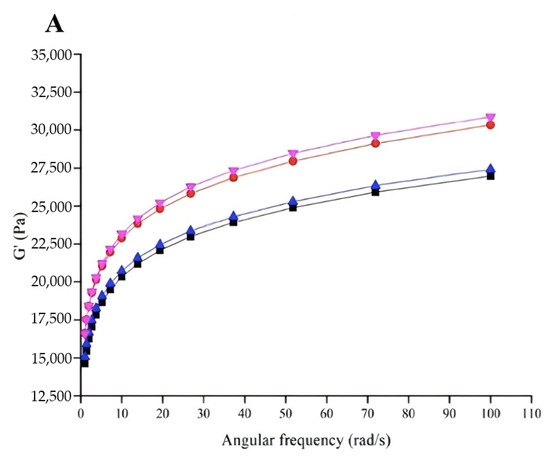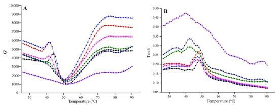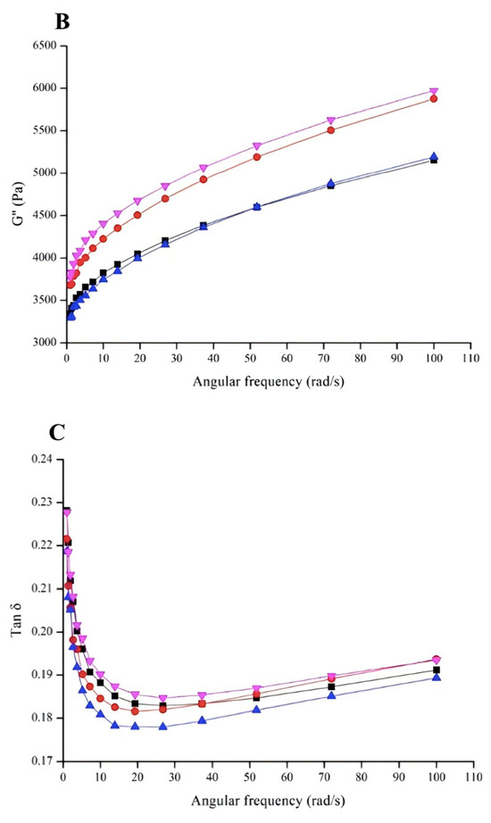 Rheological properties were assessed using a DHR1 rheometer (TA Instruments Ltd., Crawley, West Sussex, UK). Surimi gel samples were placed at the center of the carrier table, with a 1 mm slit, and 3-methylsilicone oil was applied around the sample to prevent water evaporation. Parameters were set as follows: temperature range 25 to 90 °C, heating rate 3 °C/min, strain 1% and angular frequency 10 rad/s [38]. Rheological properties of samples were quantified by the energy storage modulus (G′), loss modulus (G″) and loss coefficient ().