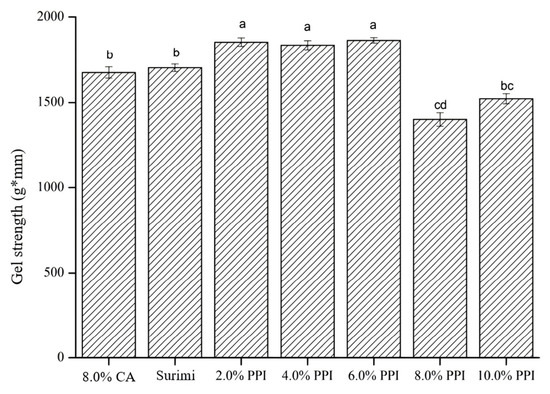 Effect of additional modified PPI on surimi gel strength; data with an identical letter indicate no significant difference between them (p > 0.05).