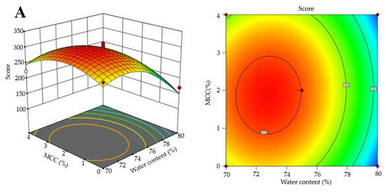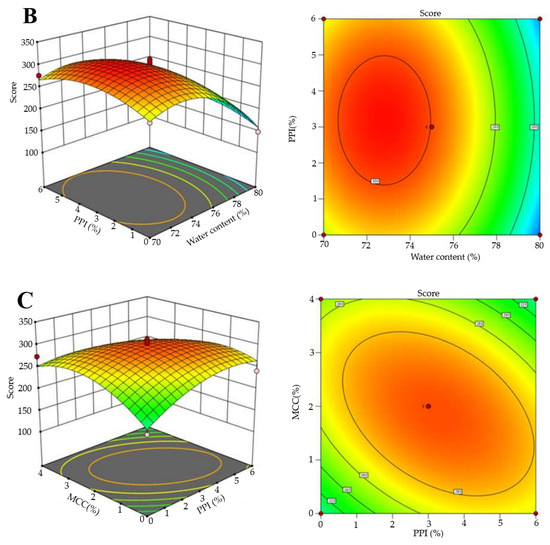 RSM experiments and results are demonstrated in Appendix A, Table A2. The relationship between moisture content (X1), modified PPI concentration (X2) and MCC concentration (X3) on the total score response, as determined through regression analysis, could be expressed by the following function (the statistical model was reasonable and reliable according to the analysis of variance in Appendix A, Table A3):