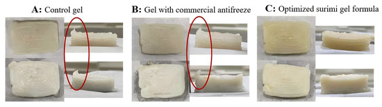 Five formulas were designed to investigate the processing properties of surimi gels based on the optimized formulation from RSM results, as shown in Table 2.