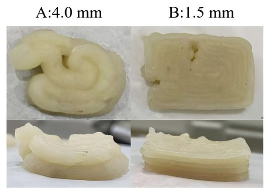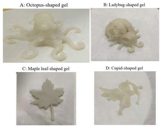 An extrusion-based 3D printer (Foodini, Natural Machines, Barcelona, Spain) was used to evaluate the 3D printability of samples. A cuboid test model (30 mm × 20 mm × 10 mm) was conducted, using a 1.5 mm diameter circular nozzle to extrude the samples on a plate at 25 °C. The volumes of printed products were measured using a Vernier caliper.